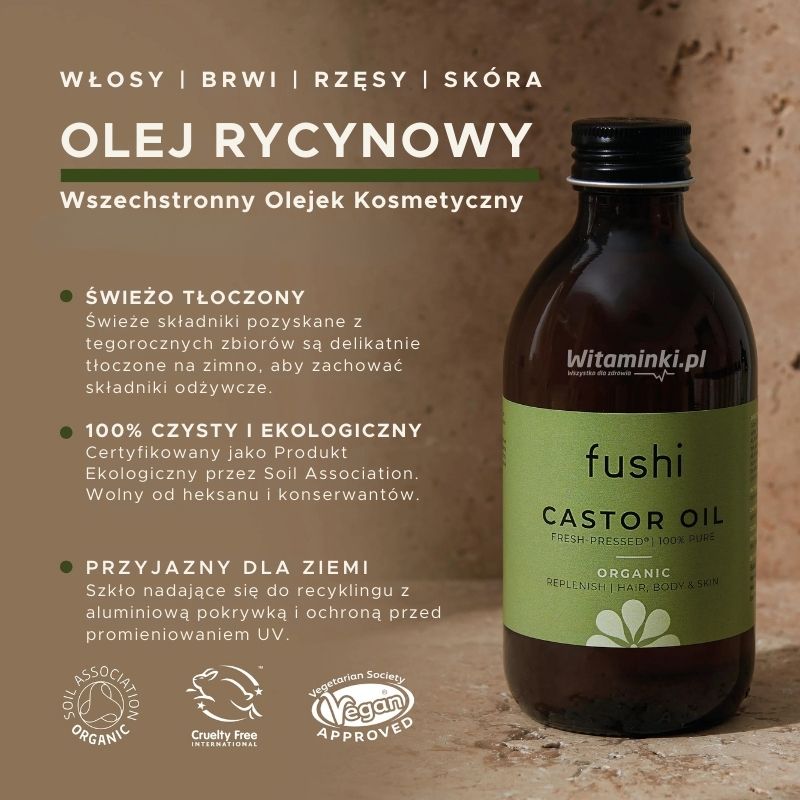• Organiczny olej rycynowy Fushi - w 100% naturalny i nierafinowany wspomaga wzrost włosów i odżywia bardzo suchą skórę.
